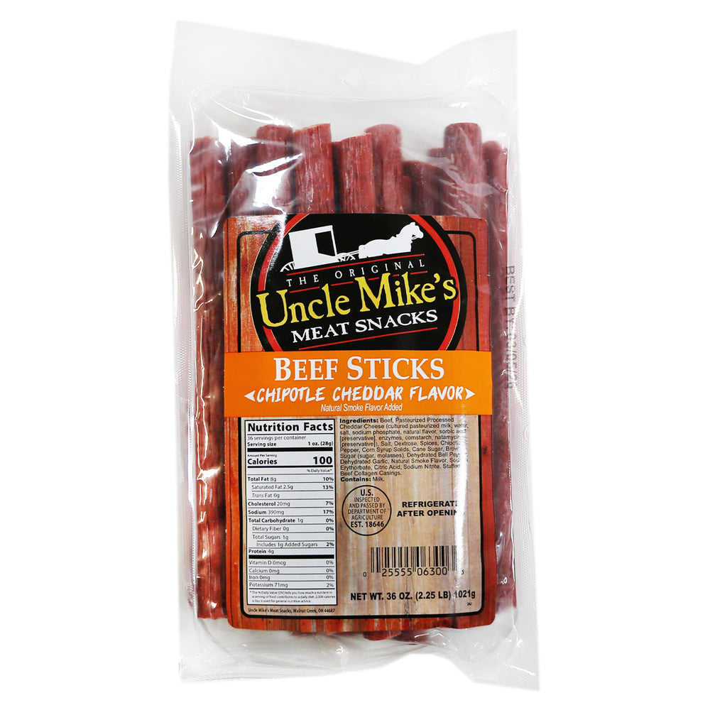 Ingredients: Beef, Pasteurized Processed Cheddar Cheese (cultured pasteurized milk, water, salt, sodium phosphate, natural flavor, sorbic acid [preservative], enzymes, cornstarch, natamycin [preservative]), Salt, Dextrose, Spices, Chipotle Pepper, Corn Syrup Solids, Cane Sugar, Brown Sugar (sugar, molasses), Dehydrated Bell Pepper, Dehydrated Garlic, Natural Smoke Flavor, Sodium Erythorbate, Citric Acid, Sodium Nitrite. Stuffed in Beef Collagen Casings.