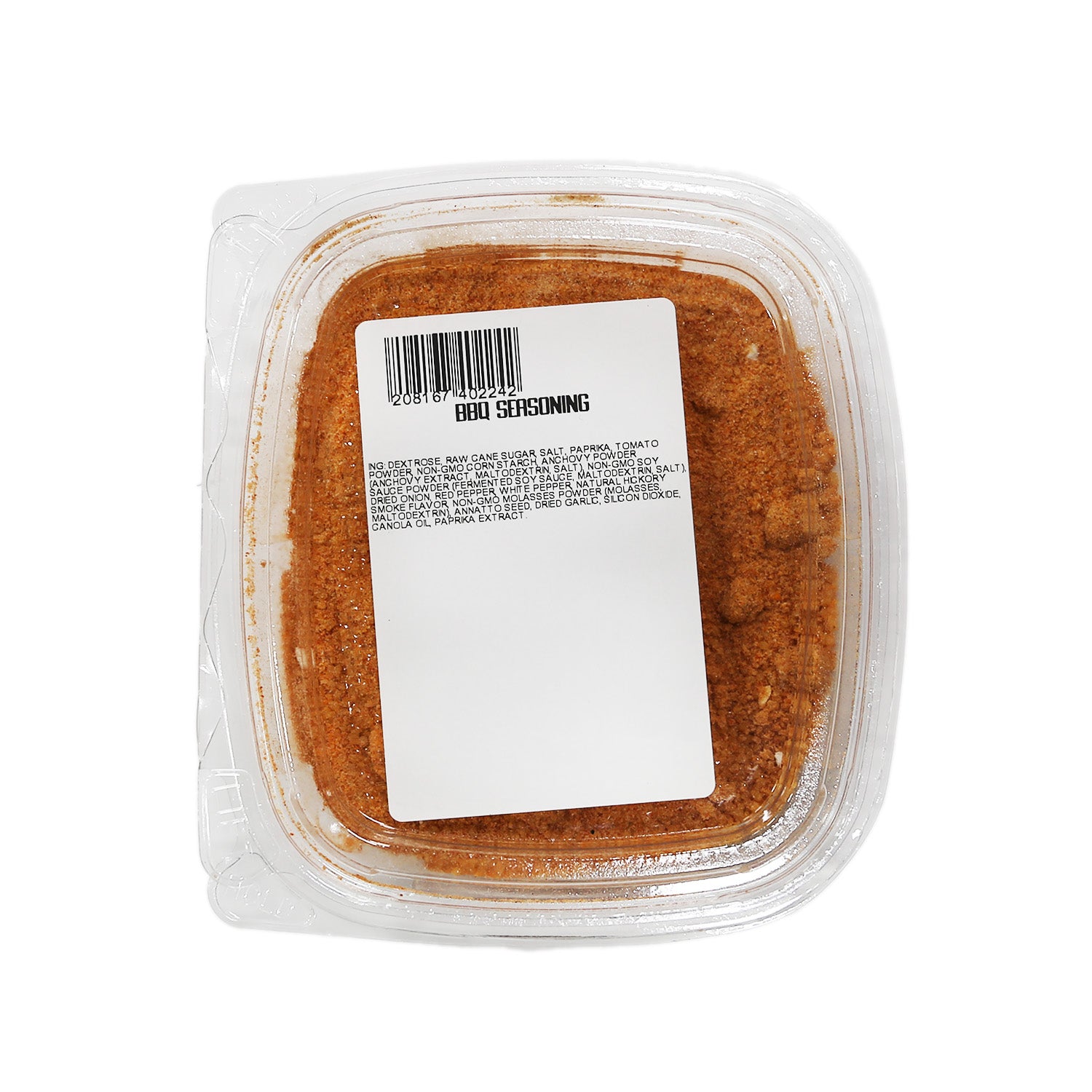 Ingredients: Dextrose, Raw Cane Sugar, Salt, Paprika, Tomato Powder (tomato, silicon dioxide [anticaking agent]), Corn Starch, Anchovy Powder (anchovy extract, maltodextrin, salt), Non-GMO Soy Sauce Powder (fermented soy sauce [contains soybean and wheat], maltodextrin, salt), Dried Onion, Red Pepper, White Pepper, Natural Hickory Smoke Flavor, Molasses Powder (molasses, maltodextrin), Annatto Seed (color), Dried Garlic, Silicon Dioxide (flow agent), Canola Oil, Paprika Oleoresin with Rosemary Extract (color).