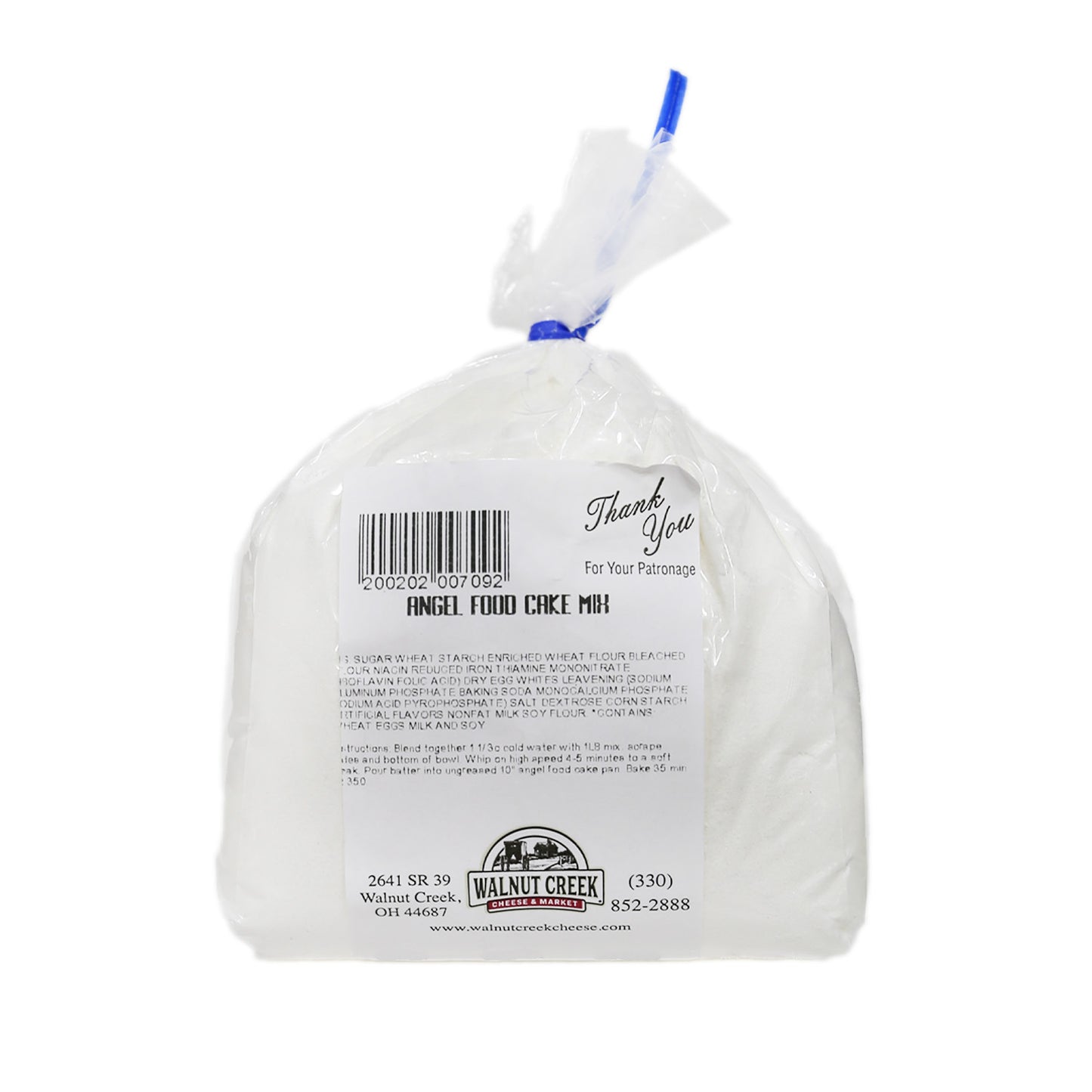 Directions: Place 1⅓ cups cold water in bowl then add 1 lb mix. Blend with a wire whip 1 minute on low speed. Scrape sides and bottom of bowl. Whip on high speed to a soft peak (approx. 4-5 minutes). Pour batter into ungreased 10" angel food pan or spread into a sheet pan with parchment liner. Bake 35 min at 350˚F. DO NOT OVERBAKE. Remove from oven, invert and let cool completely.