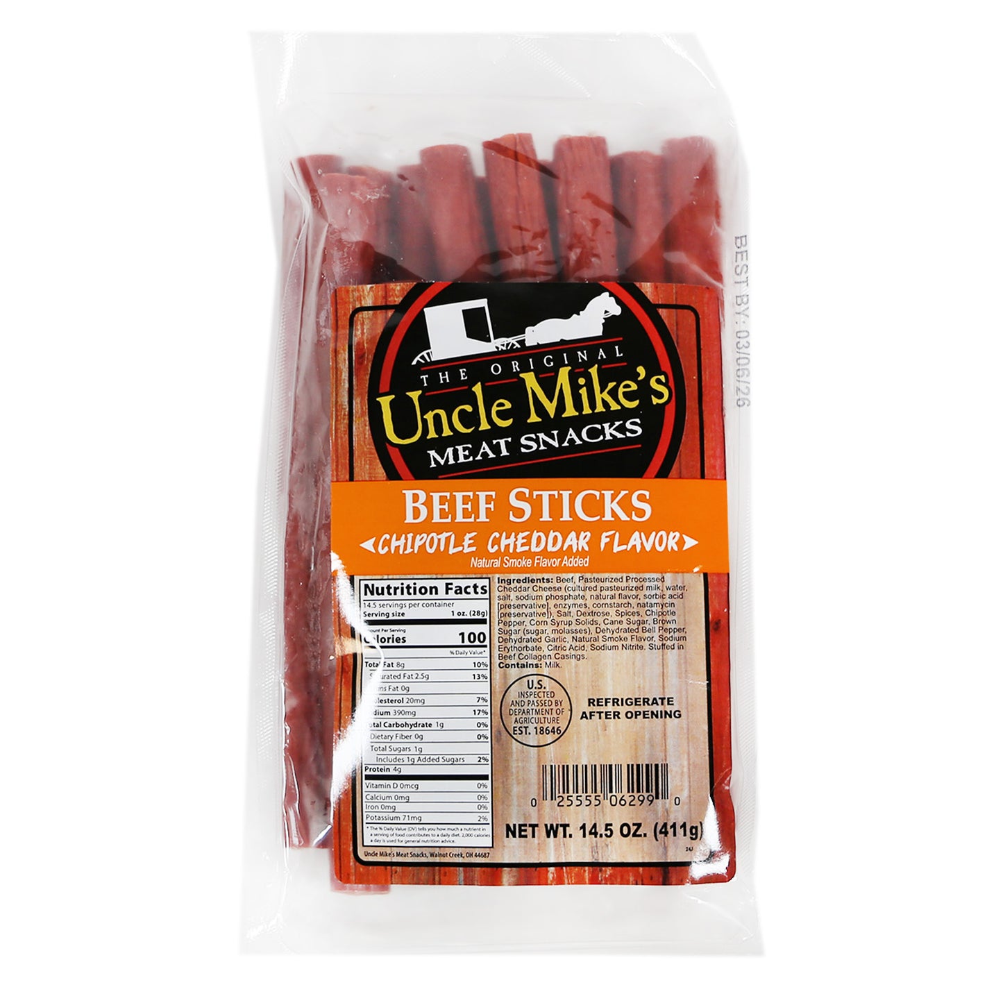 Ingredients: Beef, Pasteurized Processed Cheddar Cheese (cultured pasteurized milk, water, salt, sodium phosphate, natural flavor, sorbic acid [preservative], enzymes, cornstarch, natamycin [preservative]), Salt, Dextrose, Spices, Chipotle Pepper, Corn Syrup Solids, Cane Sugar, Brown Sugar (sugar, molasses), Dehydrated Bell Pepper, Dehydrated Garlic, Natural Smoke Flavor, Sodium Erythorbate, Citric Acid, Sodium Nitrite. Stuffed in Beef Collagen Casings.