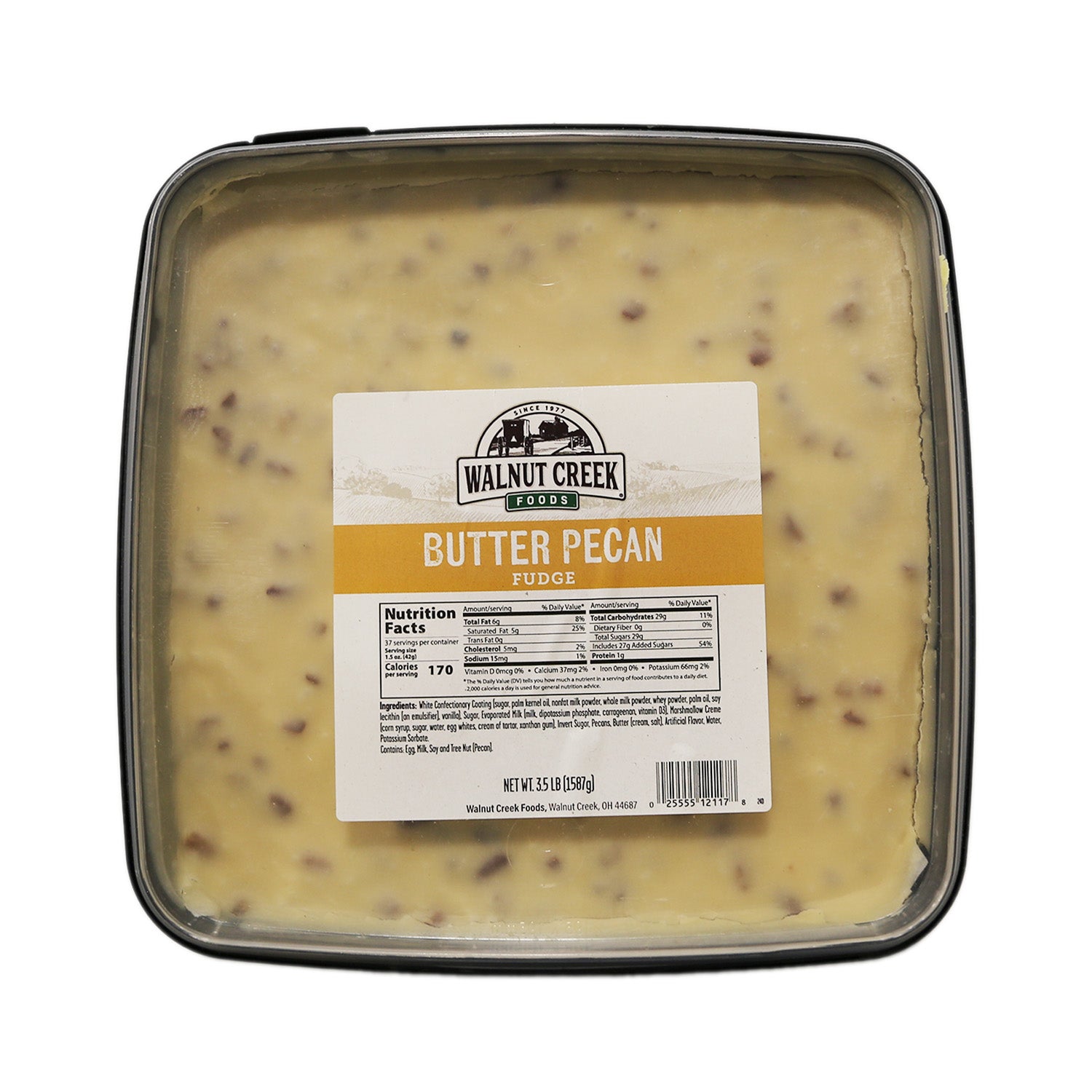 Ingredients: White Confectionary Coating (sugar, palm kernel oil, nonfat milk powder, whole milk powder, whey powder, palm oil, soy lecithin [an emulsifier], vanilla), Sugar, Evaporated Milk (milk, dipotassium phosphate, carrageenan, vitamin D3), Marshmallow Creme (corn syrup, sugar, water, egg whites, cream of tartar, xanthan gum), Invert Sugar, Pecans, Butter (cream, salt), Artificial Flavor, Water, Potassium Sorbate.