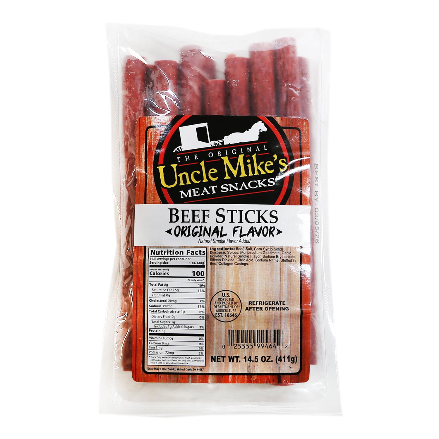 Ingredients: Beef, Salt, Corn Syrup Solids, Dextrose, Spices, Monosodium Glutamate, Garlic Powder, Natural Smoke Flavor, Sodium Erythorbate, Silicon Dioxide, Citric Acid, Sodium Nitrite. Stuffed in Beef Collagen Casings.