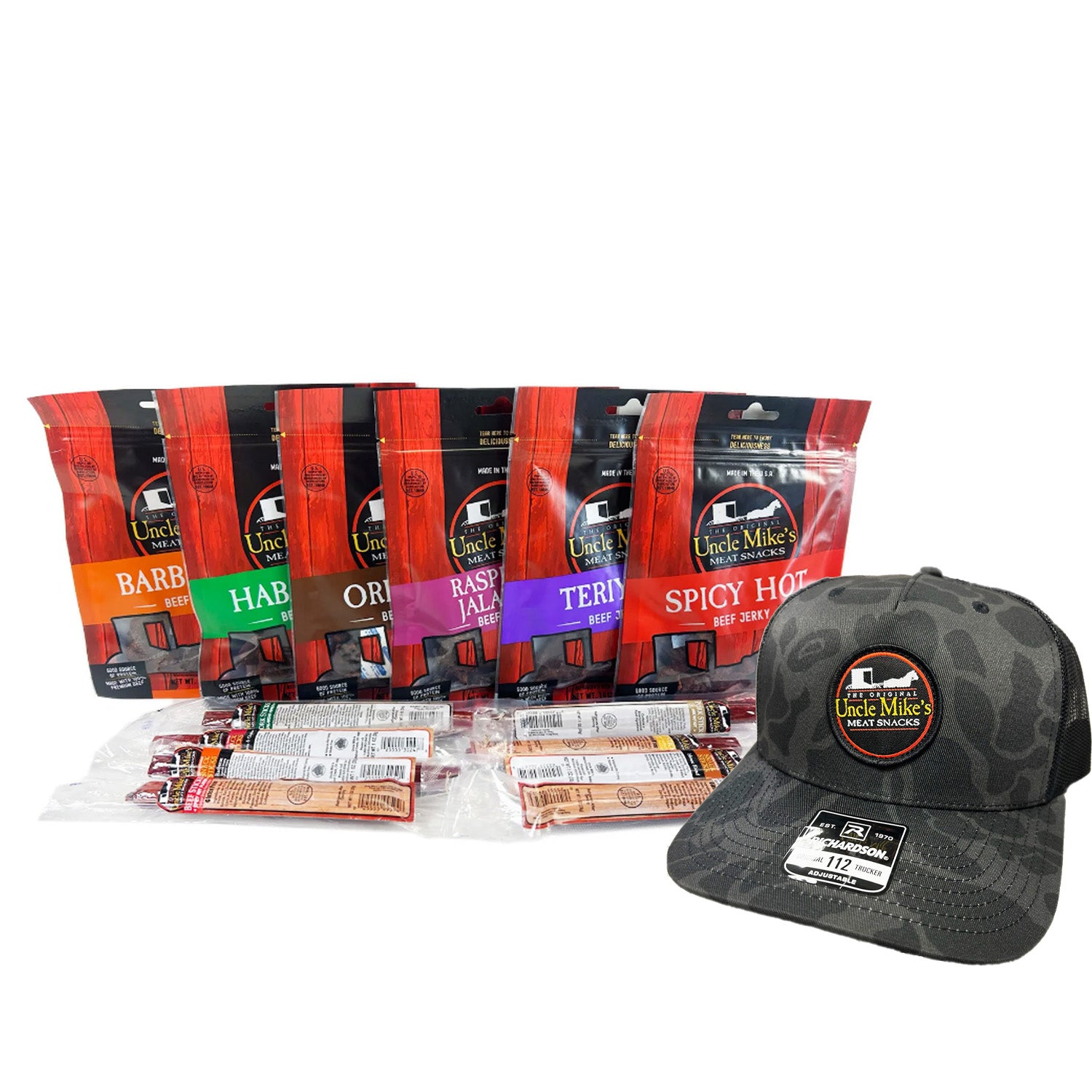 6 Beef Jerky flavors in 1.6oz bags: Original, Spicy Hot, BBQ, Teriyaki, Raspberry Jalapeno, & Habanero