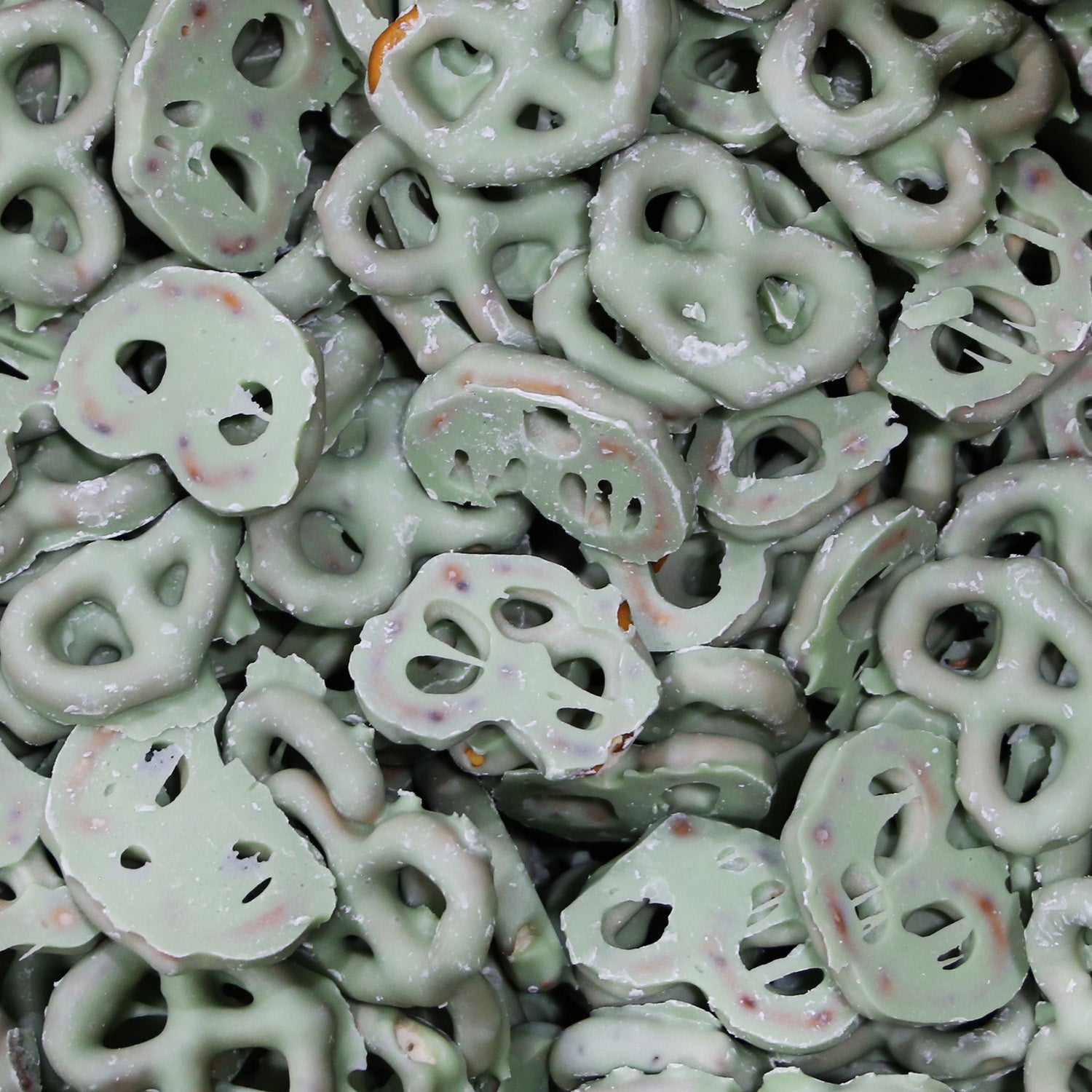 Ingredients: Key lime yogurt (yogurt flavored confectionery coating [sugar, vegetable oil {palm kernel and/or palm}, whey powder {milk}, dry nonfat yogurt {milk}, soy lecithin {an emulsifier}, salt, natural vanilla extract], natural key lime flavor, green color [spirulina extract, soybean oil, annatto extract, trisodium citrate]), pretzels (unbleached enriched wheat flour [flour, niacin, reduced iron, thiamine mononitrate-B1, riboflavin-B2, folic acid], malt, salt, soybean oil and/or canola oil, yeast).